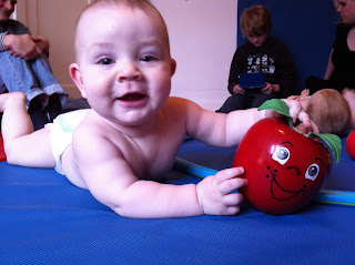 Nach einigen Teilnahmen beim Pekip habe ich festgestellt, dass der Baron nicht nur Allgemein auf rotes Spielzeug steht sondern ganz besonders auf einen Apfel von der Firma Fisherpice. In der Mitte der Babyrunde liegt meist ein kleines Highlight für alle, vielleicht als Motivation, hinzukrabbeln. Häufig lag eben dieser große rote Plastikapfel, der bei Berührung nicht nur hin und her wippte, sondern dabei auch einen lieblichen Klang von sich gab. Für den musikalisch begabten Baron natürlich das Beste.
