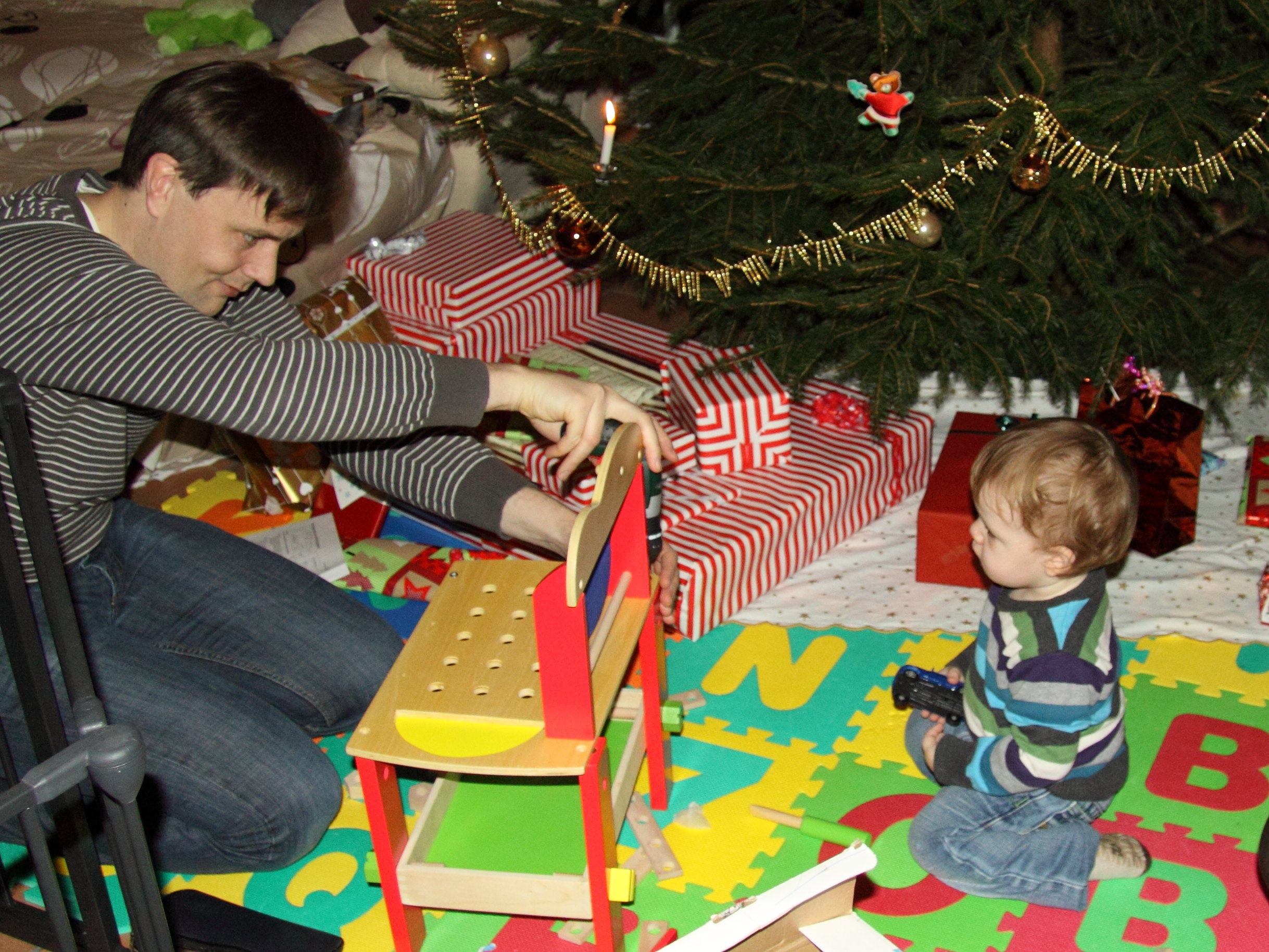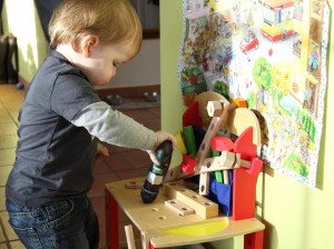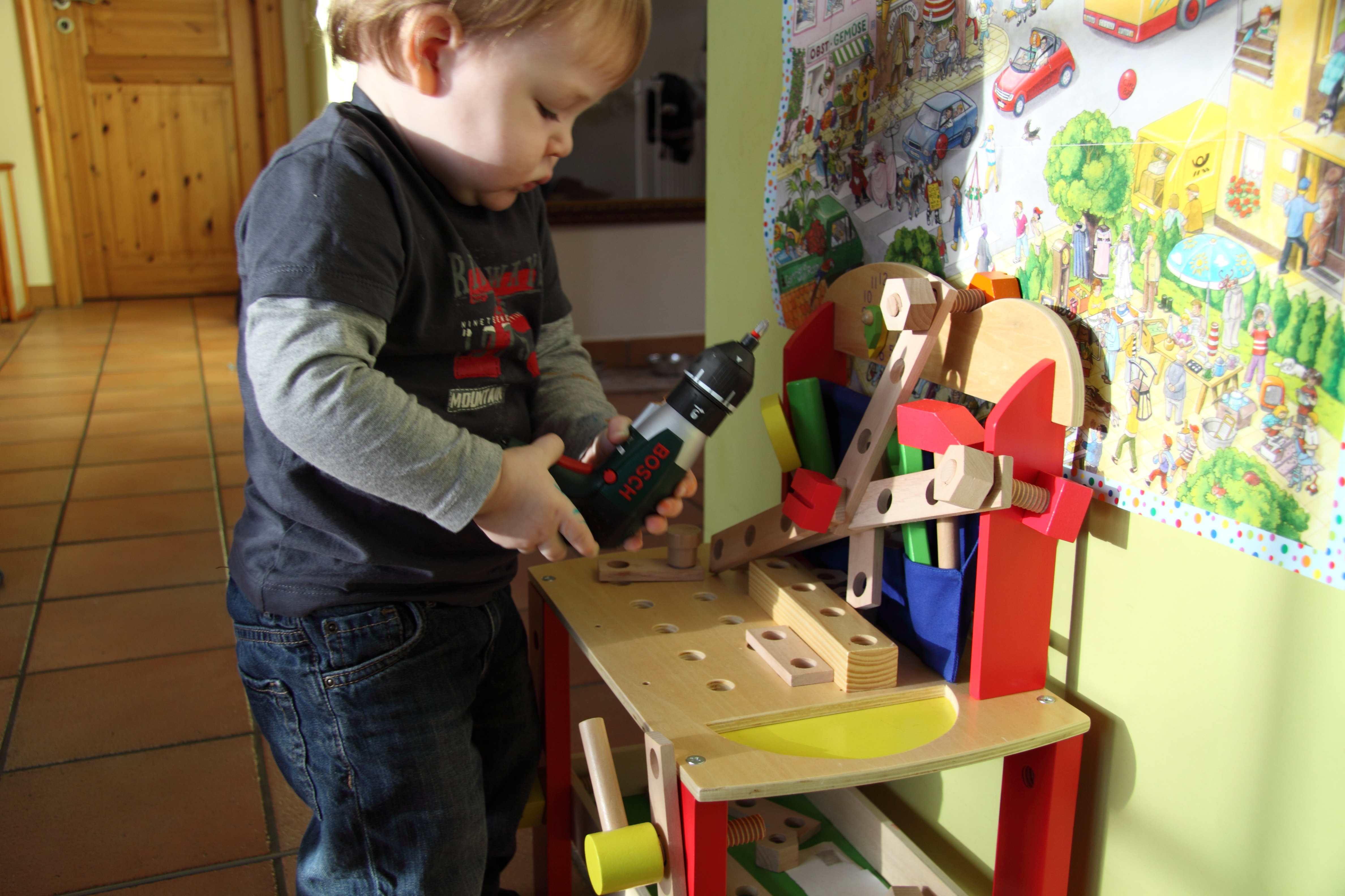 Zu Weihnachten gab es von Oma und Opa eine kleine Werkbank, deren Schrauben hin und wieder dort hinein und wieder herausgedreht wurden. Ansonsten wurde mit der kleinen Spielzeugsäge auch mal gern ein Arm oder ein Bein angesägt. 🙂 Ansonsten war das Interesse noch nicht allzu groß, dort aktiv mit zu spielen.