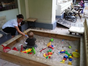Um den Sandkasten sind Sitzgelegenheiten drapiert, so dass jeder den Kindern beim Spielen zuschauen kann.