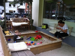 So begab es sich, dass eine Freundin zum Käffchen anrief und dafür sogar einen perfekten Ort in ihrer Nähe vorschlug. Dieses Café soll nicht nur eine Spielecke besitzen sondern auch noch eine Sandkiste vor der Tür haben. Das Café sei gut besucht und Kaffee und Snacks sollen besonders lecker sein.