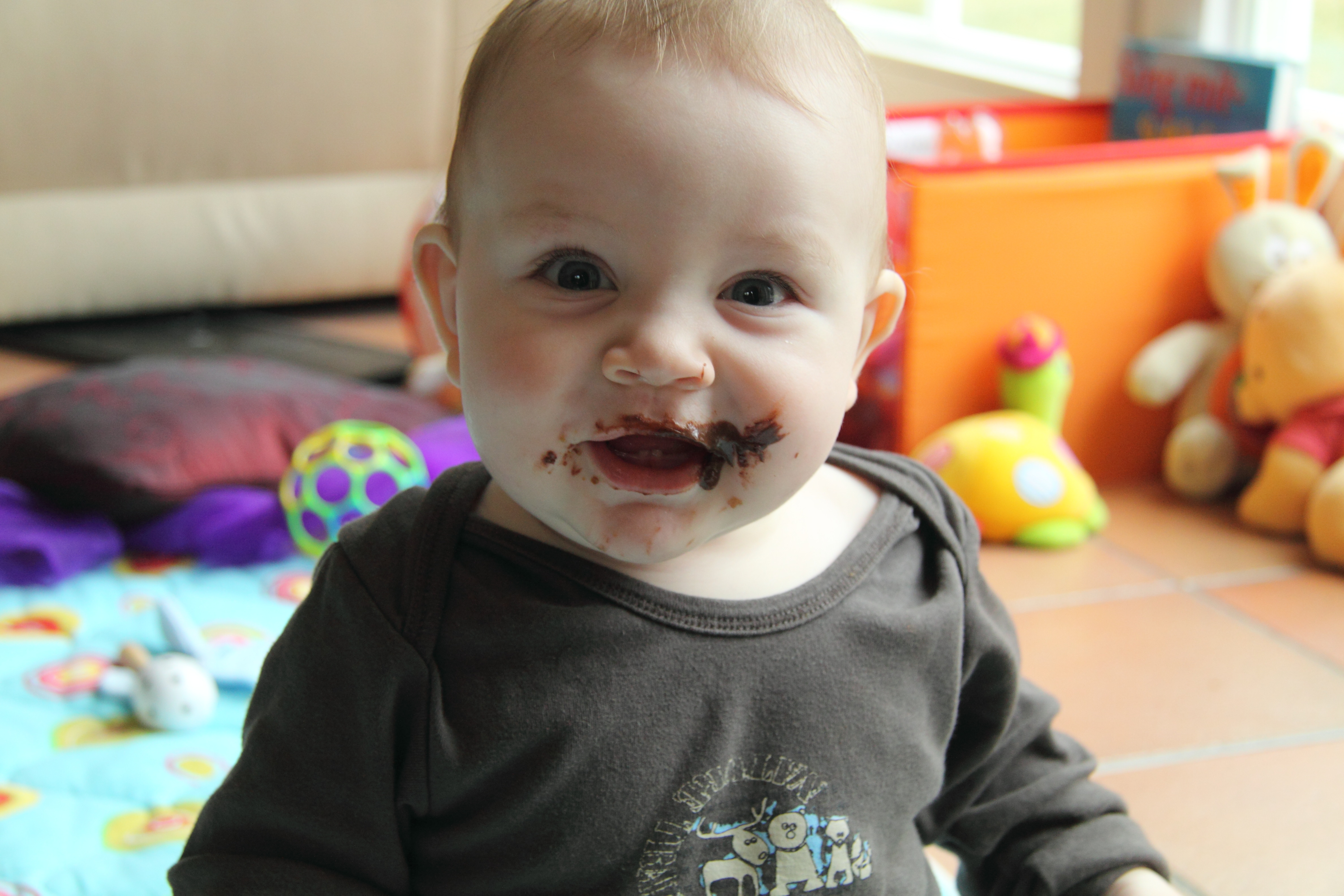 Das gleiche Spielchen heute Nachmittag in der Krabbelgruppe. Brötchen mit Nutella, Baron krabbelt auf mich zu, Mund auf und rein damit! 🙂 Es wurde zu einer Schoko-Orgie wie man auf dem folgenden Bild sehen kann: