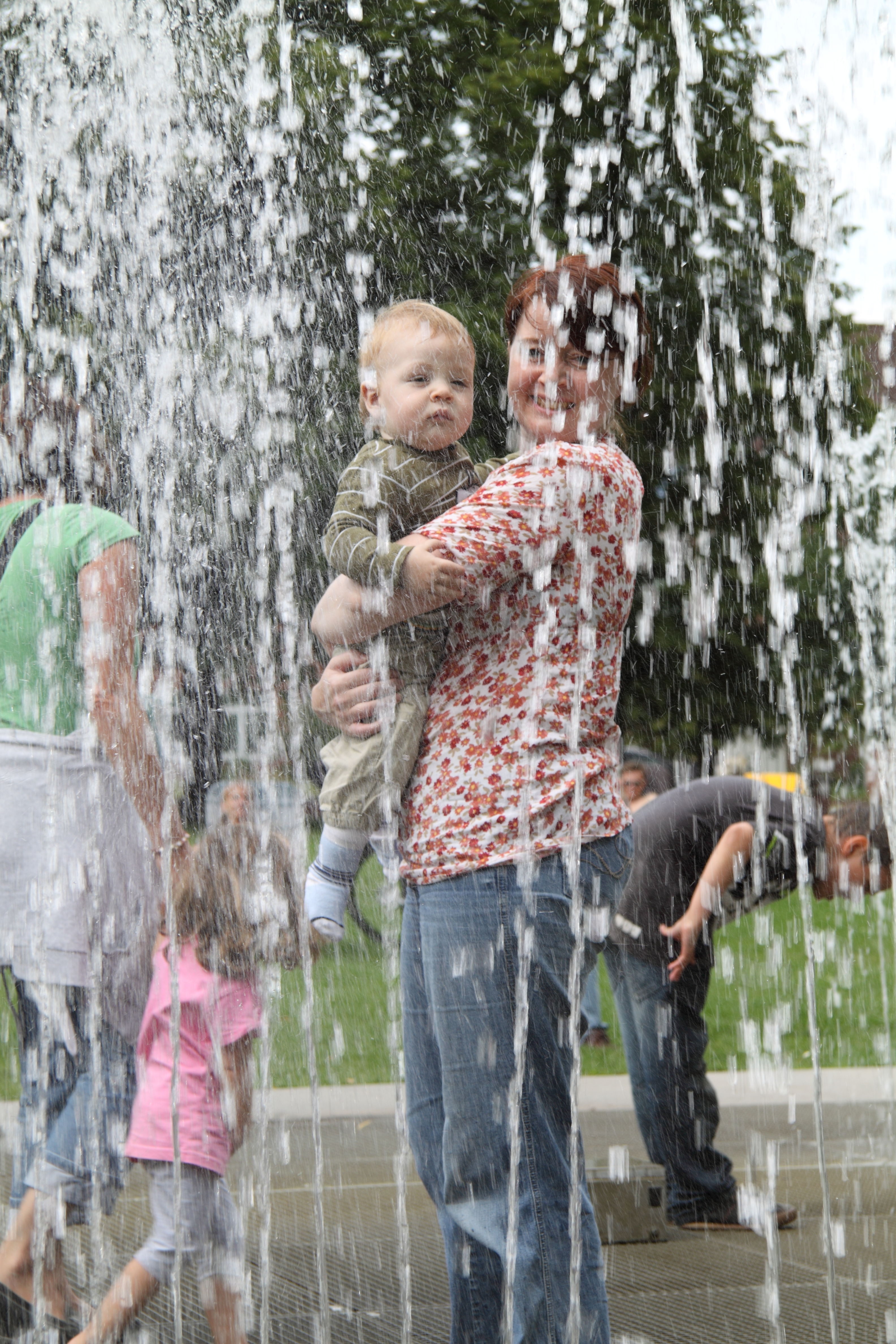 Mit dem Baron in den Wasserspielen des Stadtparks. Sobald er danach greifen wollte, verschwanden die Wasserstrahlen, dank Sensor! 🙂
