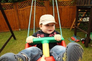 Eines der Geschenkehighlights war die Schaukel, die der Ehemnn sofort an das Gerüst befestigte und den Baron reinsetzte. Heute hoffe ich noch auf eine Elektronik, die die Schaukel mit einem Knopfdruck von allein schaukeln lässt. Denn nach knappen 20 Minuten Baronanschubsen, fallen mir die Arme ab. 😉