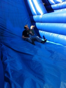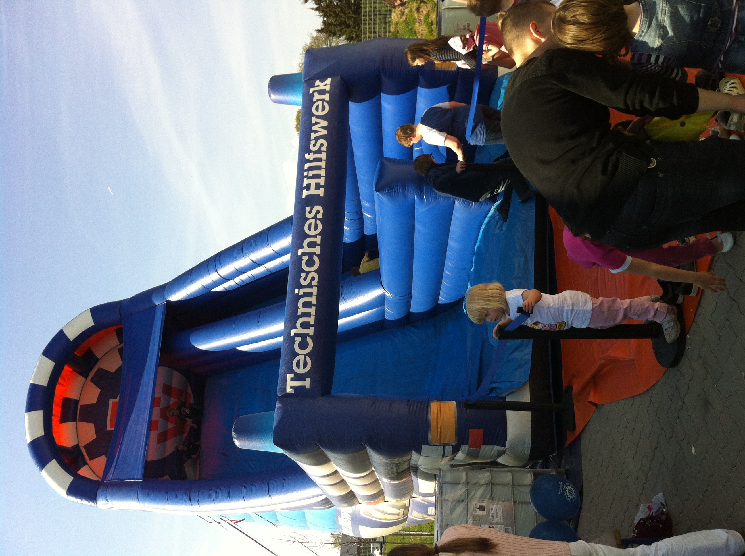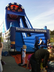 Das absolute Highlight war allerdings die große Rutsche, die auf dem Hof aufgebaut wurde. Da war der Schrecken, der mächtigen Fahrzeuge wie weggeblasen: