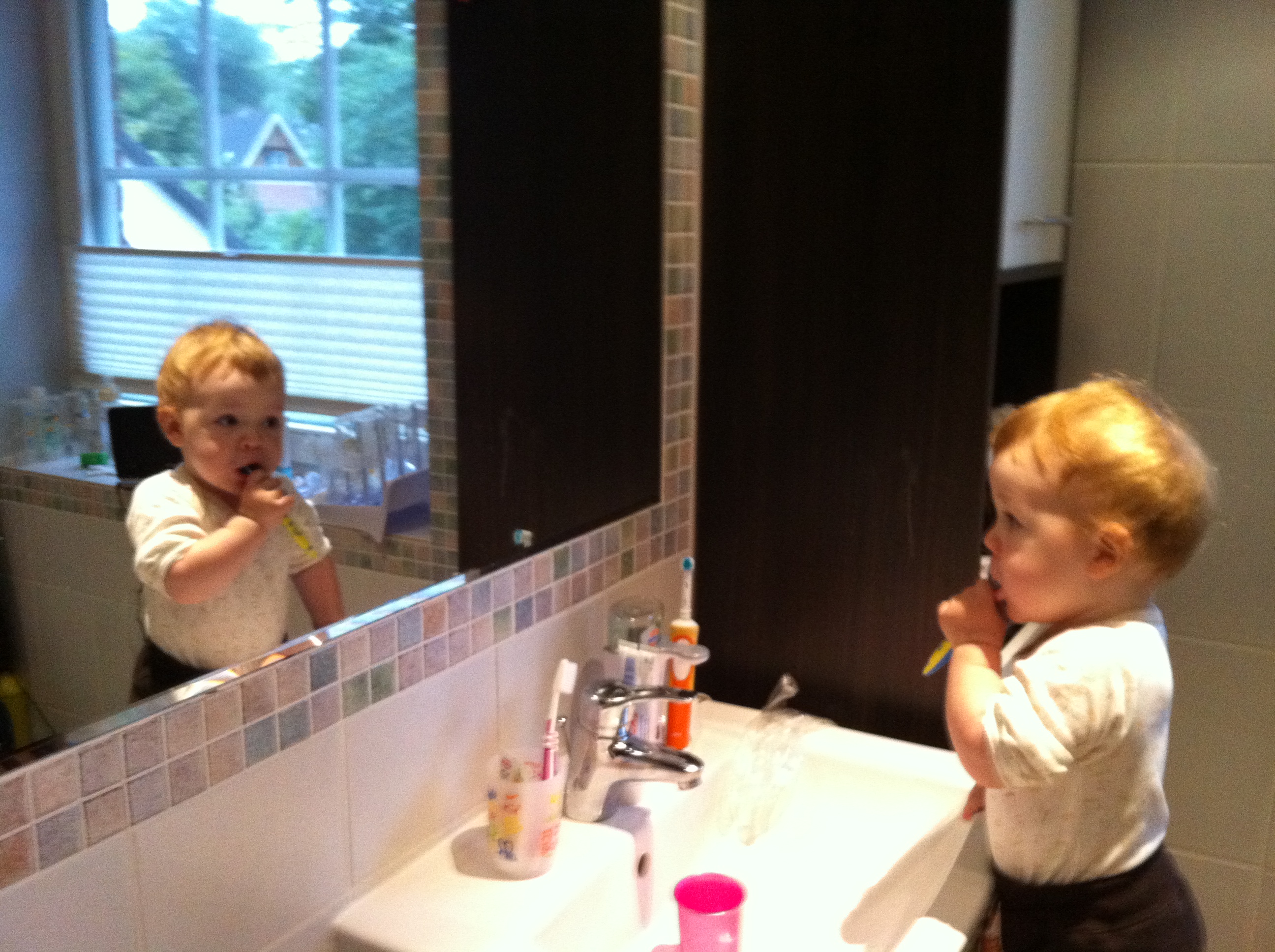 Zahnputztraining Tag 2: Zielstrebig wurde die Zahnbürste in die Hand genommen; Wieder wurden Haare und Schrank damit geputzt; Der Zahnputzbecher wurde mehrmals mit Wasser gefüllt und wieder ausgekippt; Mamas Zähne wurden begutachtet;