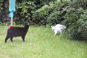 Die kleine weiße Katze wurde gleich von Besucherkatze No. 3 eingenordet!