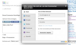Ihr könnt euch also zuerst über euren Social-Network-Account anmelden und dann einen Kommentar schreiben, oder ihr schreibt euren Kommentar und geht danach auf „Absenden als…“. Dann bekommt ihr die Möglichkeit, euer soziales Netzwerk auszuwählen oder den Kommentar als Gast zu hinterlegen. Die geforderte Mail-Adresse wird nicht veröffentlicht sondern wird als Sicherheit hinterlegt und ist nur für mich als Admin sichtbar.